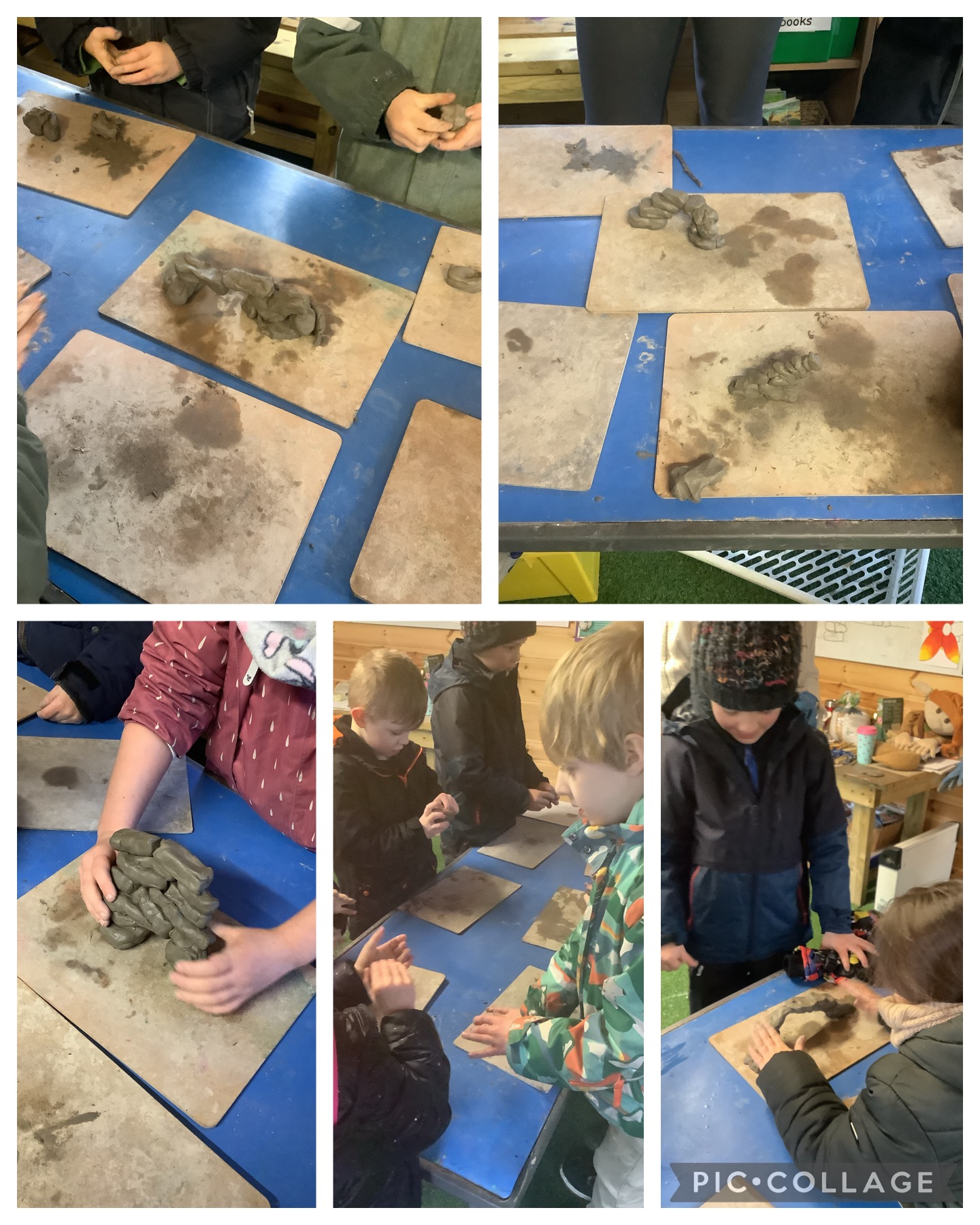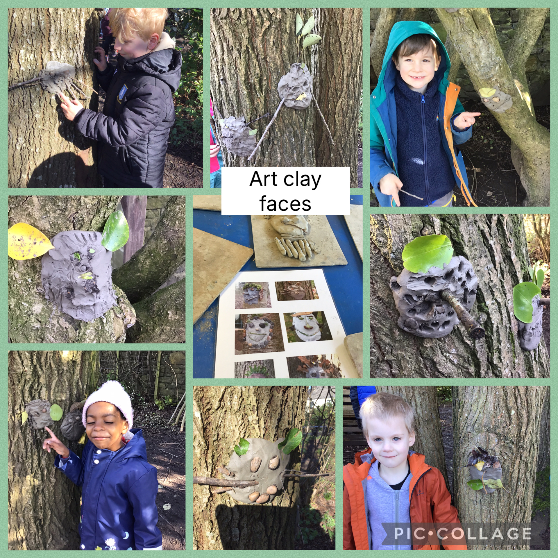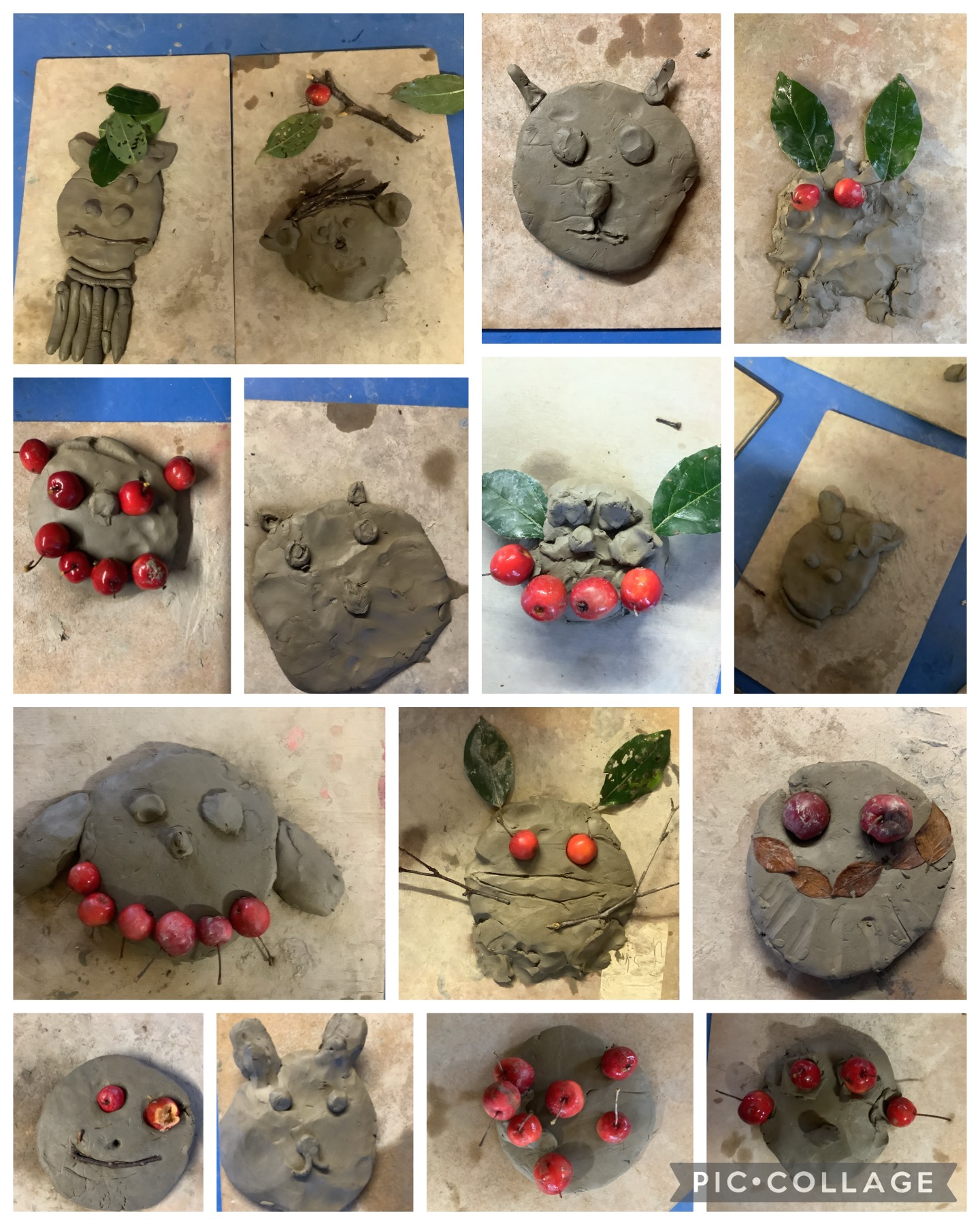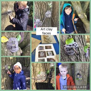 This week at forest schools we have been looking at the weather in Science and we drew our own symbols for the different weather types. In Art we have been thinking about texture and have created some rubbings using leaves from the garden. We found the holly leaves made the best leaf pattersn. We also learnt about the artist Anonty Gormley. We used his sculptures as inspiration to make clay faces on the trees in the garden. We used natural materials from the garden to decorate them.