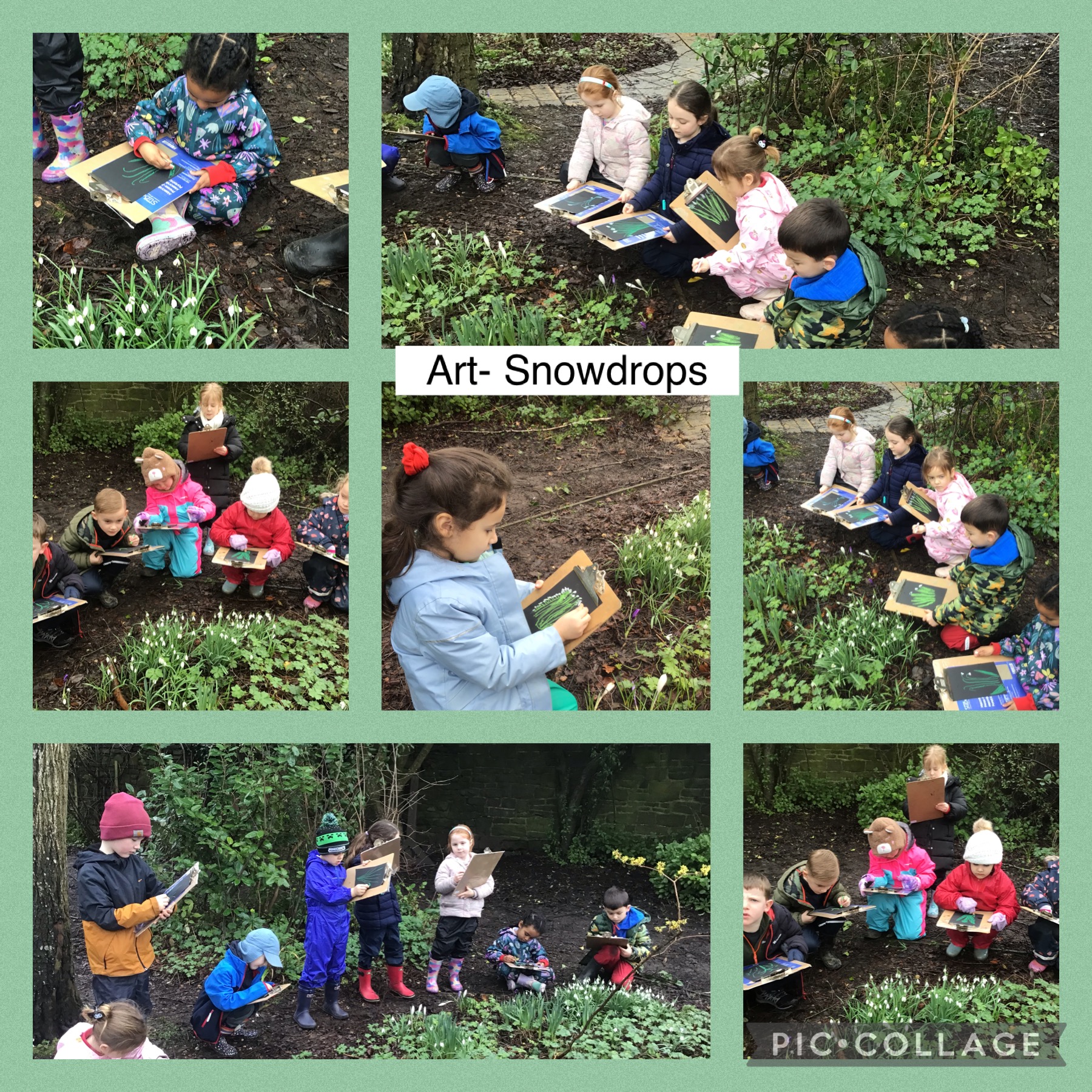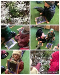 This week at forest schools we have been observing the weather and making weather vanes. We have also been learning about evergreen and deciduous trees. We have named and identified the trees in our school environment. We have lots of trees such as Silver Birch, Weeping Willow, Lime, Maple, Larch, Ash, Oak, Holly and Hawthorne. Mrs Platts has taught us some facts about each of the trees and how we can identify them. We have also looked at the artist Andy Goldsworthy again and created a clay bridge sculpture inspired by his work. We also looked at a new artist this week called Antony Gormley and created our own clay faces using natural materials, these are all stuck on the trees in the garden. In the garden this week we found some… Snowdrops! We have created observational drawings of the snow drops using pastels.