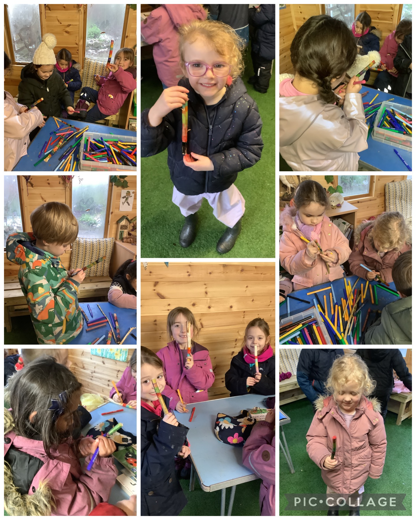 This week at forest schools we have been observing the weather and making weather vanes. We have also been learning about evergreen and deciduous trees. We have named and identified the trees in our school environment. We have lots of trees such as Silver Birch, Weeping Willow, Lime, Maple, Larch, Ash, Oak, Holly and Hawthorne. Mrs Platts has taught us some facts about each of the trees and how we can identify them. We have also looked at the artist Andy Goldsworthy again and created a clay bridge sculpture inspired by his work. In the garden this week we found snowdrops! We have created observational drawings of the daffodils using pastels.