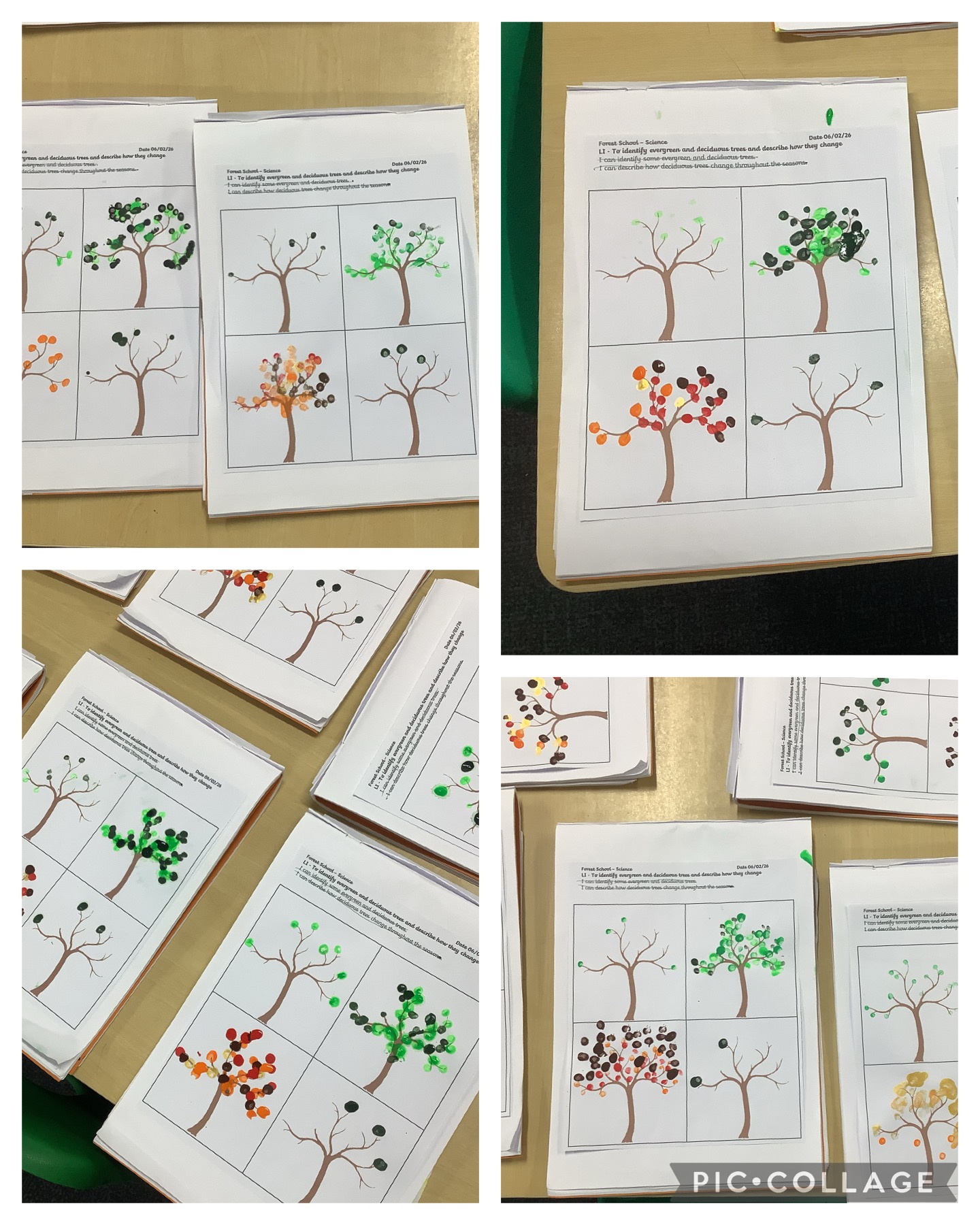 We have had another wet and soggy week at Forest School! This week we have recapped out knowledge of trees and identified which are evergreen and which are deciduous. We have named and identified the trees in our school environment. We have lots of trees such as Silver Birch, Weeping Willow, Lime, Maple, Larch, Ash, Oak, Holly and Hawthorne. Mrs Platts has taught us some facts about each of the trees and how we can identify them. We have thought carefully about how these trees are different and how deciduous trees change through the seasons. We then went onto create our own artwork to show what we had remembered.