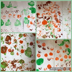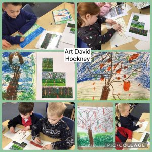 This week at forest schools we have been learning about the 4 seasons and the changes across the seasons. We talked about what the weather and day length is like and what clothes we may wear in the different seasons. We even talked about which season was our favourite. Mrs Cann likes Autumn because the leaves start to change colour and fall off the trees. In Art we have been learning to print using a range of vegetables such as pepper, sweetcorn and broccoli. It was messy and fun! In DT this week we also got to use the bow saw to cut disc of wood. Mrs Platts helped us to use the bow saw safely. We have also looked at the artist David Hockney and his Springtree drawings. We used charcoal and pastels to create an observational drawing of an Apple tree in Spring.