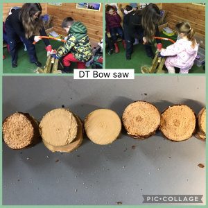 In DT this week we also got to use the bow saw to cut disc of wood. Mrs Platts helped us to use the bow saw safely.