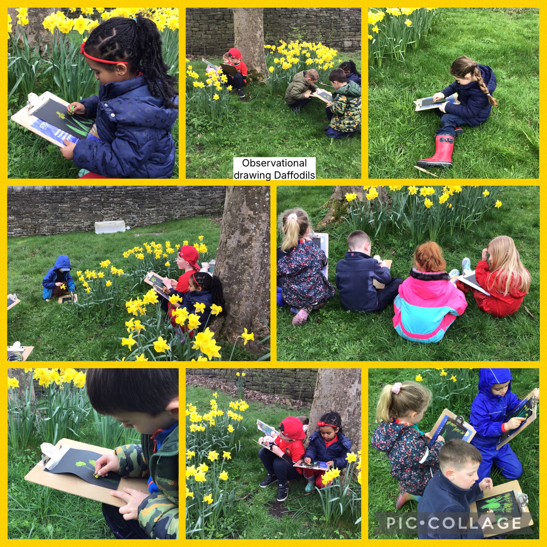 This week at forest schools we have been observing the weather and making weather vanes. We have also been learning about evergreen and deciduous trees. We have named and identified the trees in our school environment. We have lots of trees such as Silver Birch, Weeping Willow, Lime, Maple, Larch, Ash, Oak, Holly and Hawthorne. Mrs Platts has taught us some facts about each of the trees and how we can identify them. We have also looked at the artist Andy Goldsworthy again and created a clay bridge sculpture inspired by his work. In the garden this week we found another Spring flower… daffodils! We have created observational drawings of the daffodils using pastels.