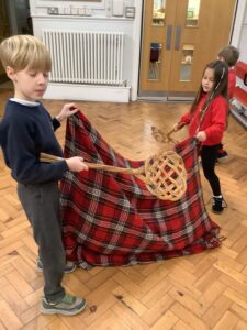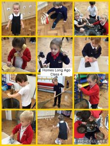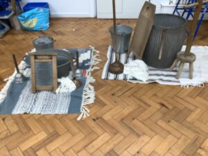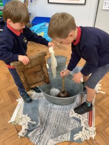The children explored daily household chores from the past. They used a ‘posher’ and a ‘dolly’ to wash the clothes. It was hard work getting all the stains out with the scrubbing boards! They had a big pile of ironing to do and had to make sure everything was folded neatly.